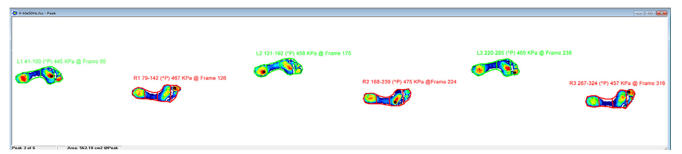 ●Monitoring of plantar pressure distribution during walking, with a focus on the maximum pressure point.